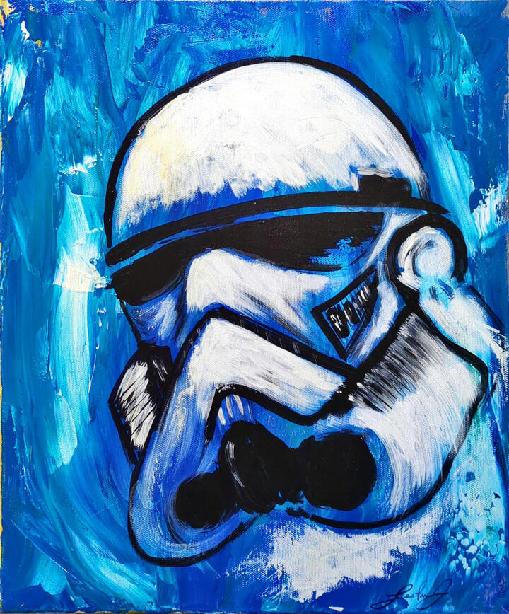 This painting presents a striking fusion of strength and introspection. The stormtrooper, a symbol of discipline and conformity, is depicted in a moment of deep thought—contrasting with its usual representation of unwavering obedience. The swirling blue background enhances the sense of internal conflict, as if the character is questioning its purpose or role. The use of expressive brushstrokes and bold contrasts suggests themes of identity, individuality, and the struggle between duty and self-awareness.