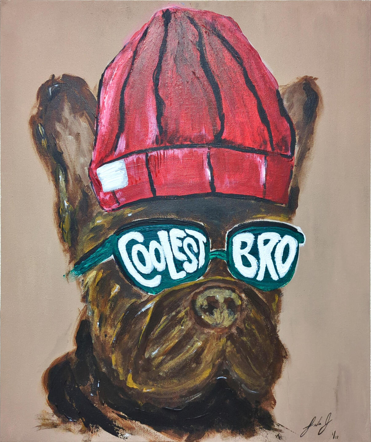 This artwork exudes confidence, attitude, and individuality. The dog, dressed in a stylish beanie and bold sunglasses with the words "Coolest Bro," represents a laid-back, charismatic personality. The use of vibrant colors, especially in the accessories, contrasts with the earthy tones of the dog, emphasizing its cool and effortless vibe. It could symbolize self-expression, owning one's uniqueness, and embracing a carefree yet confident outlook on life.