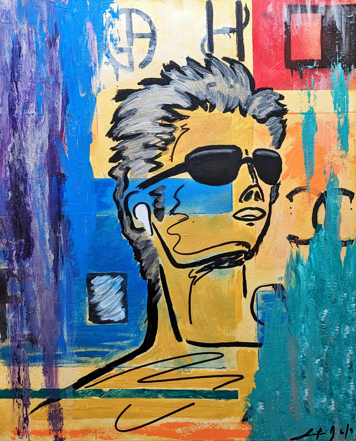 This painting radiates confidence, individuality, and a modern, urban energy. The bold use of color, abstract background elements, and fragmented textures create a dynamic atmosphere. The figure, wearing sunglasses and earphones, suggests a sense of detachment or cool composure, as if lost in their own world. The blend of structured lines and expressive brushstrokes reflects the contrast between control and spontaneity. This piece could symbolize self-expression, the influence of music and media, or the idea of maintaining an identity amidst a chaotic, ever-changing environment.